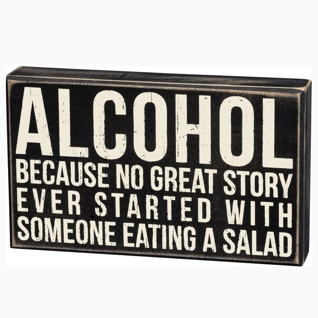 This box sign from Primitives by Kathy says “Alcohol, because no great story ever started with someone eating a salad.” Which is so true!