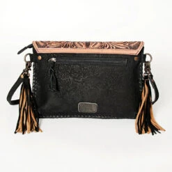 This is such a classy looking purse! The sculpted black leather with the light tan tooled leather top is a standout!!