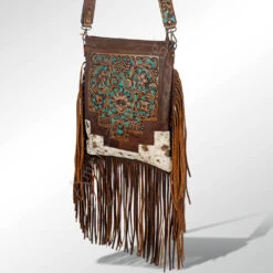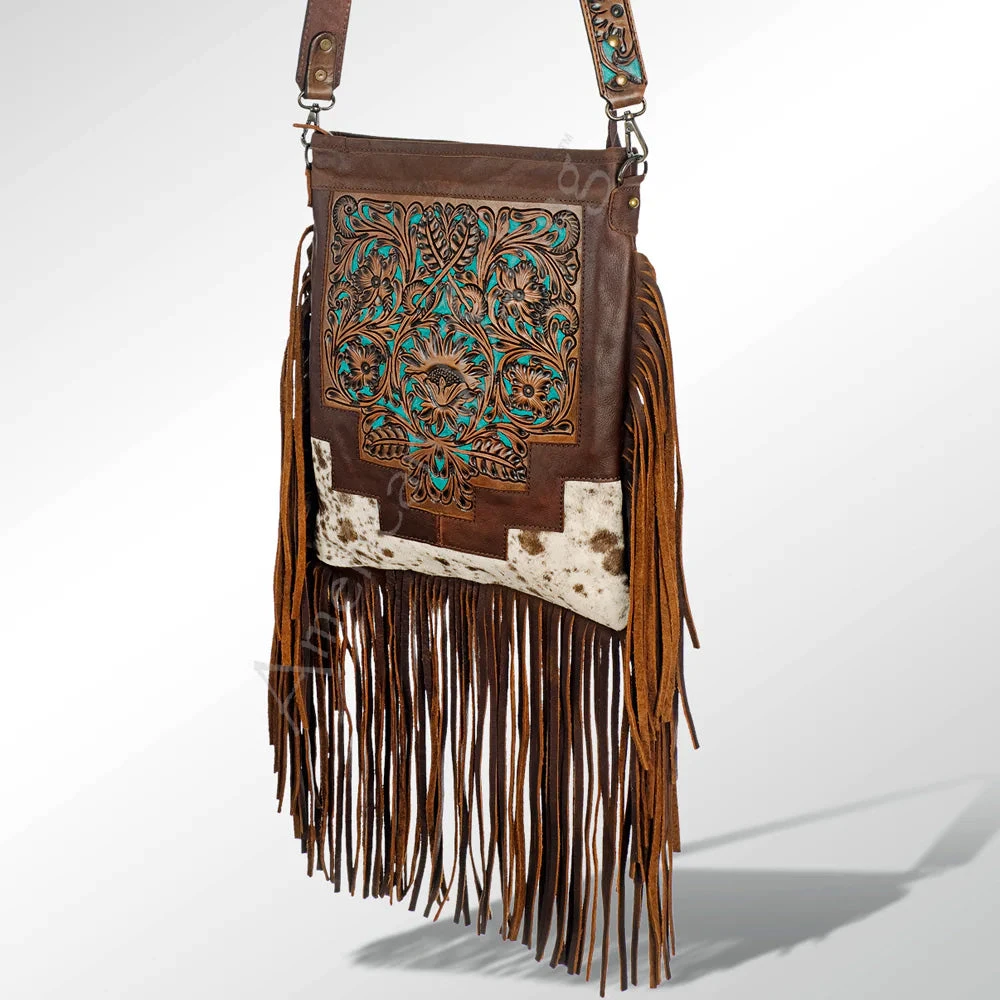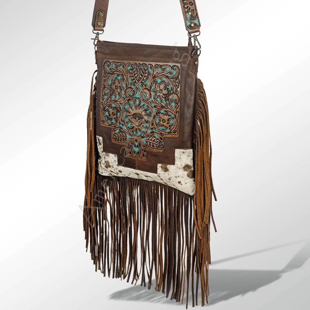 Check out this cute, tooled leather purse with a fun flare of cow hide leather at the bottom!