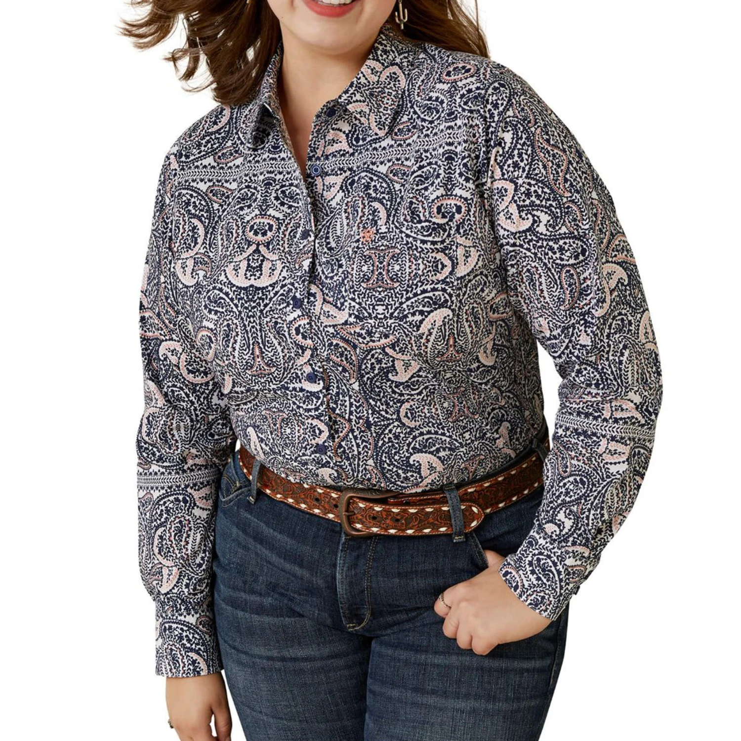 This stylish shirt has a bold paisley print. Pair with your favorite jeans for work or going out.