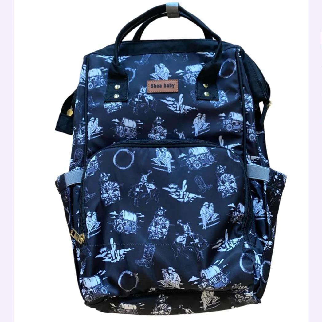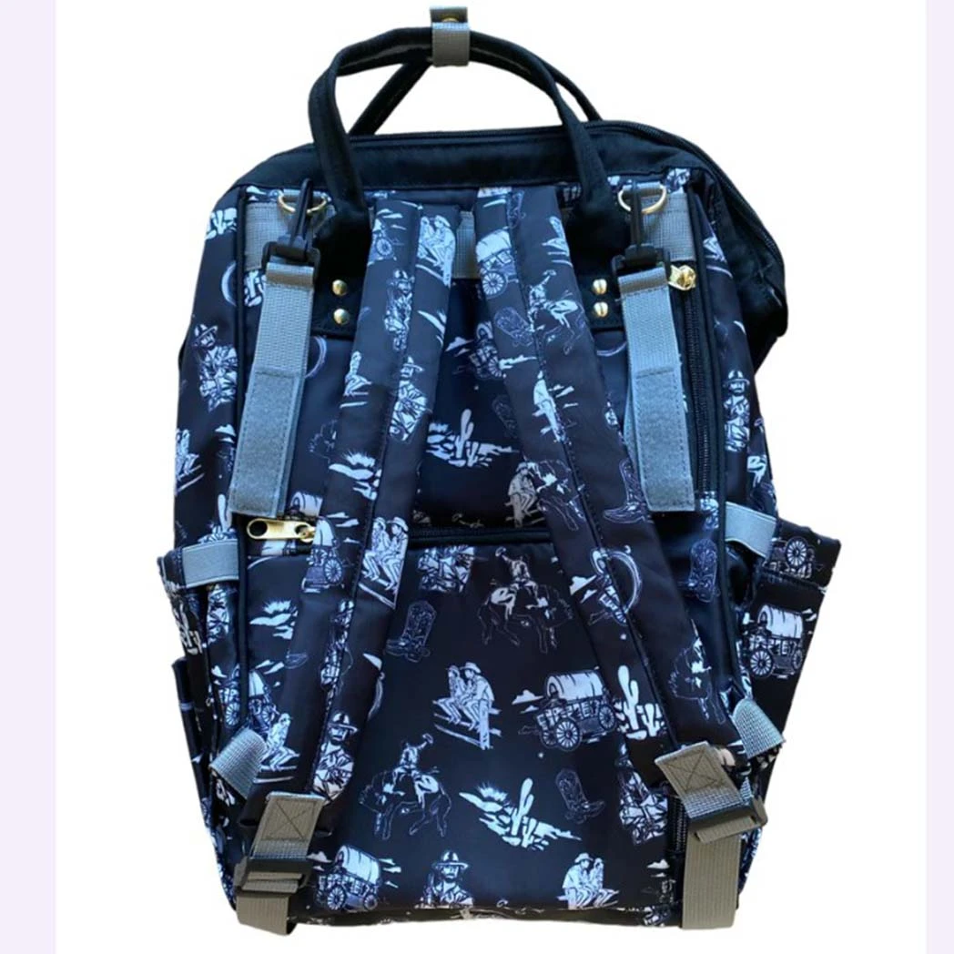 This is an adorable Western diaper bag that has so many wonderful pockets and places for all your little cowboys necessities. Also features a backpack shoulder straps for easy carrying. Easily wipes down for fast cleaning.