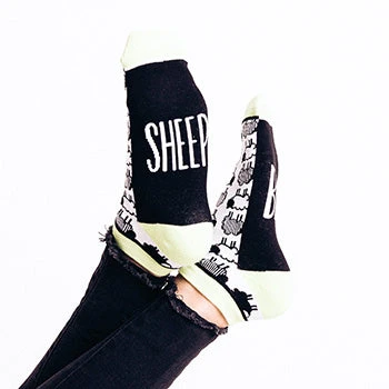 These crew socks feature sheep on the top and the saying black sheep on the bottom. Toes and heels have extra padding to keep your feet comfy.