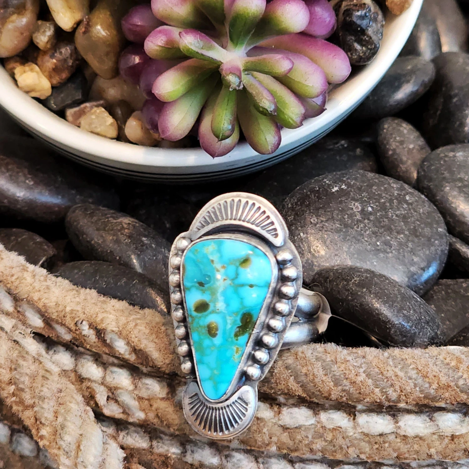 Just look at this beautiful Kingman turquoise ring! That color paired with beautiful silver work gives this ring a great look.