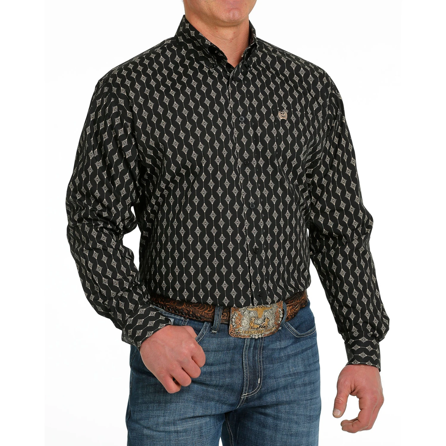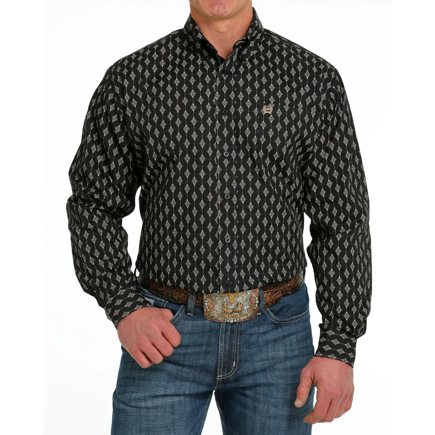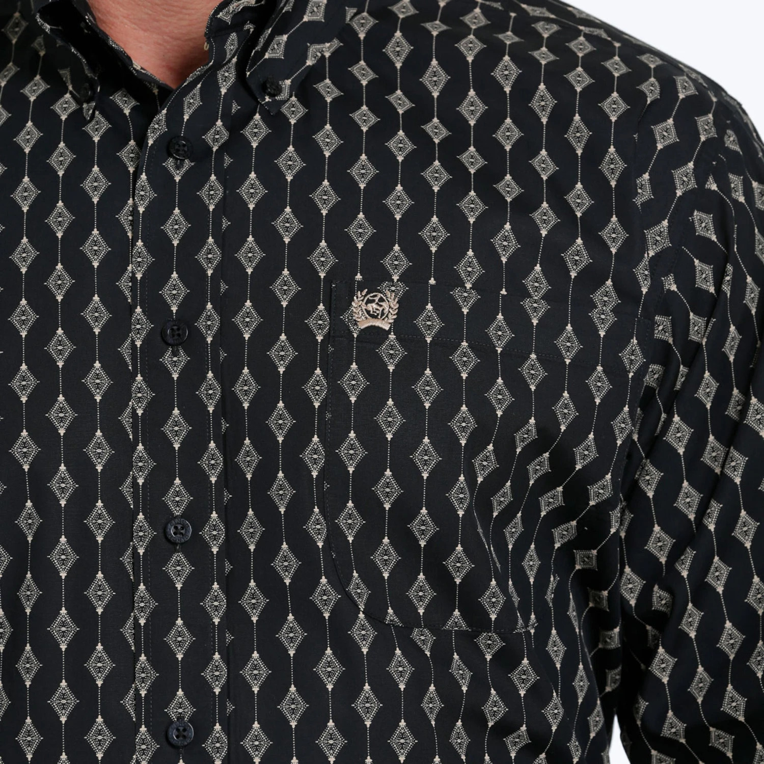 Whether you are going to work or a night out you will look sharp in this diamond print shirt. It has a diamond pattern throughout, one open chest pocket and adjustable cuffs.
