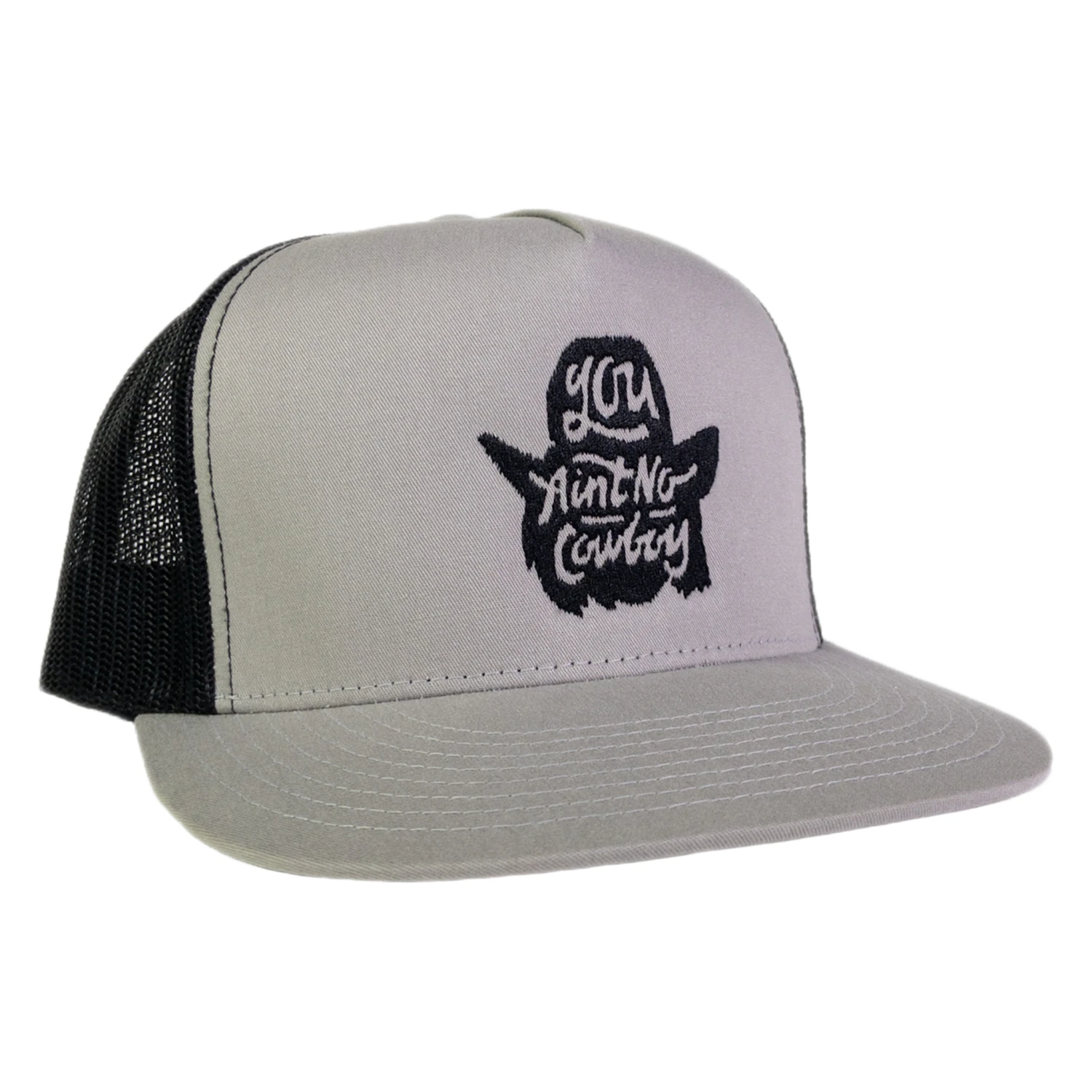 “You Ain’t No Cowboy” printed on this Dale Brisby flatbill is one of the most famous quotes from the Dale Brisby line up. It features a silhouette silver and black image of Dale Brisby himself behind the writing.
