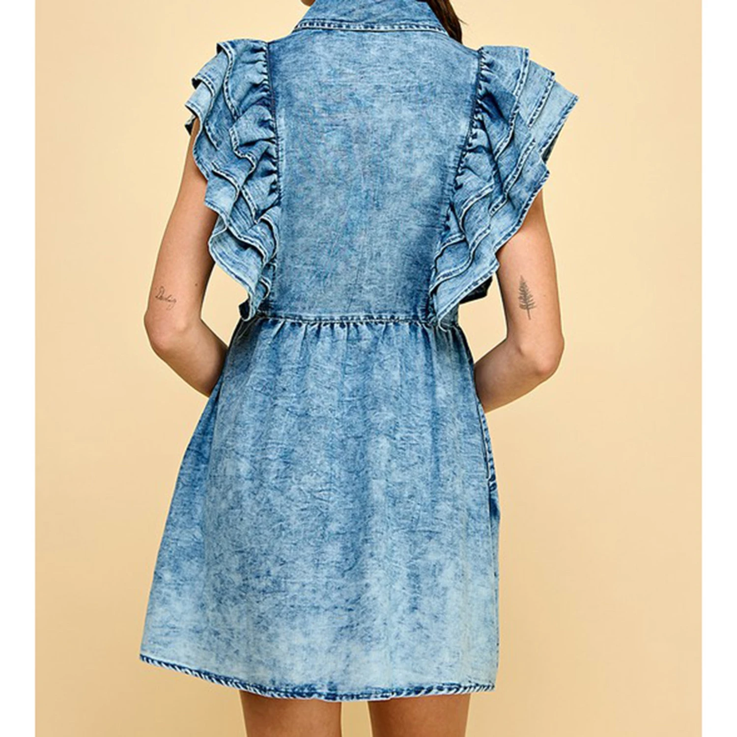 The ruffle sleeves accent this denim dress. It features an elastic waistband, side pockets, front button down and a classic collar. Wear alone or with some leggings.