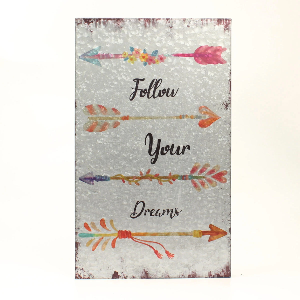 Add an authentic rustic feel to your home with this metal wall hanging sign by M&F Western Products. This sign features 4 arrows and the words Follow Your Dreams between the arrows. This inspirational wall hanging would make a great gift for that special person in your life or get it for your home.