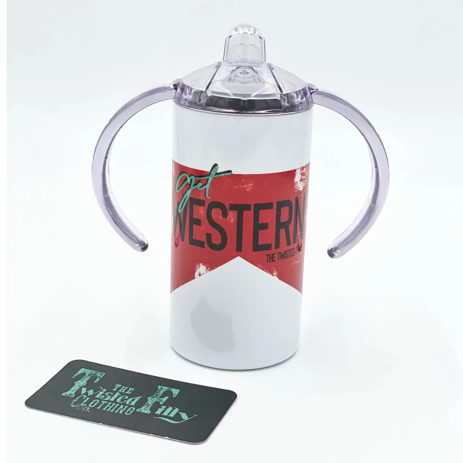 Every little cowboy/cowgirl needs this “Get Western” sippy cup! It holds 12 oz, is insulated and leak proof. It is made of metal, durable, and has handles for easy gripping.