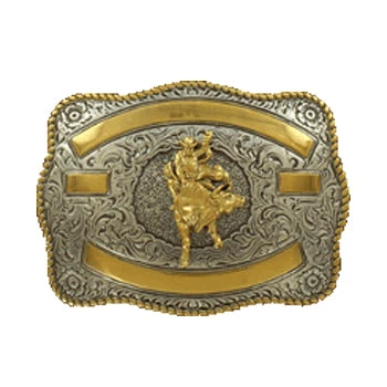 You can personalize this silver crumrine buckle by M&F Western Products®. It features a gold bull rider in the center, a gold rope trim around the edge, and top, bottom and sides ribbons