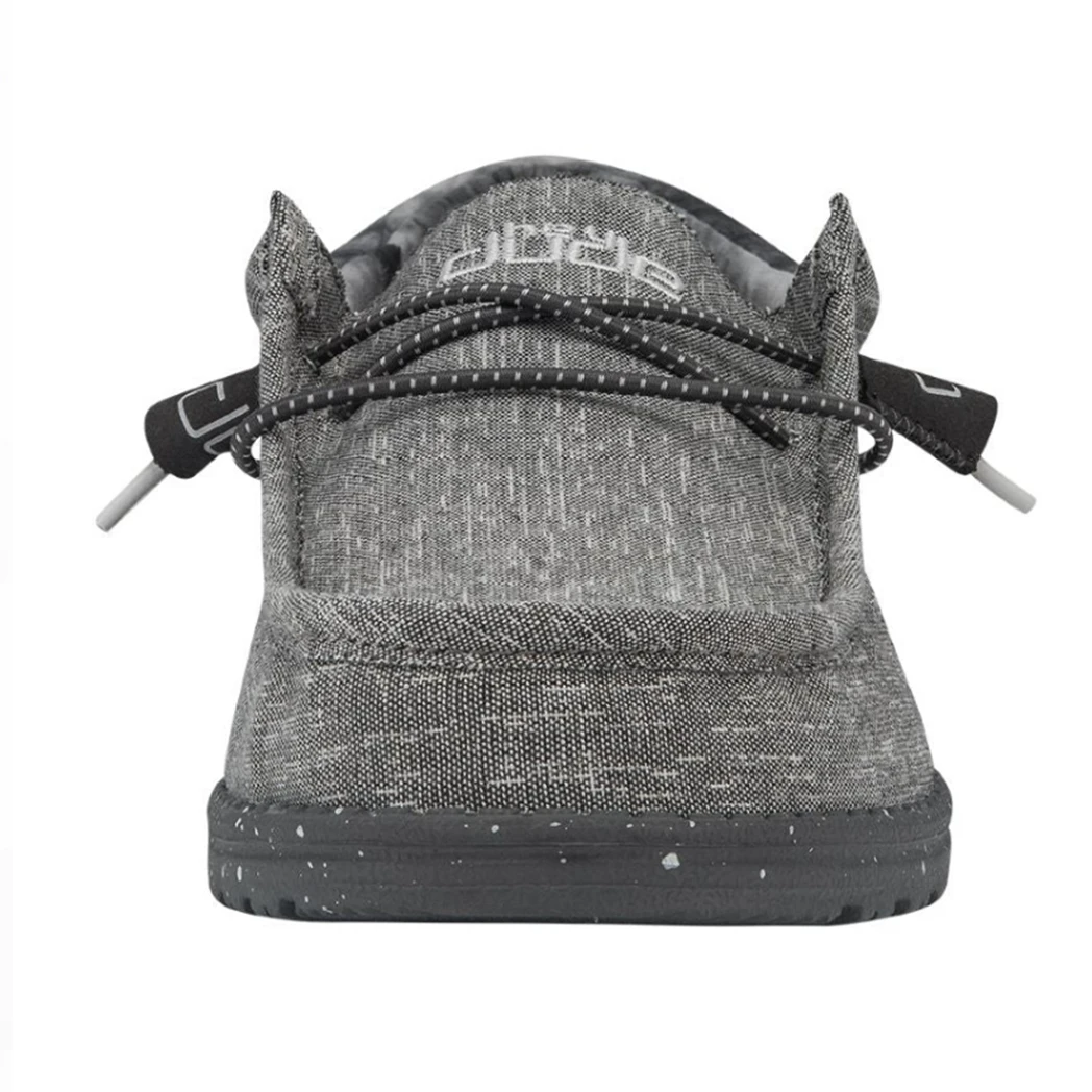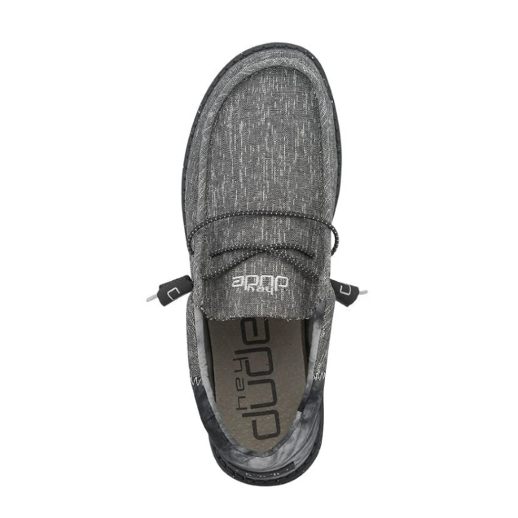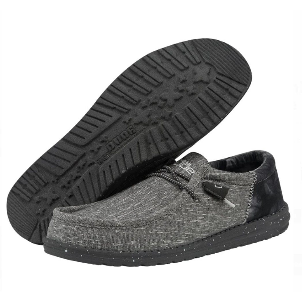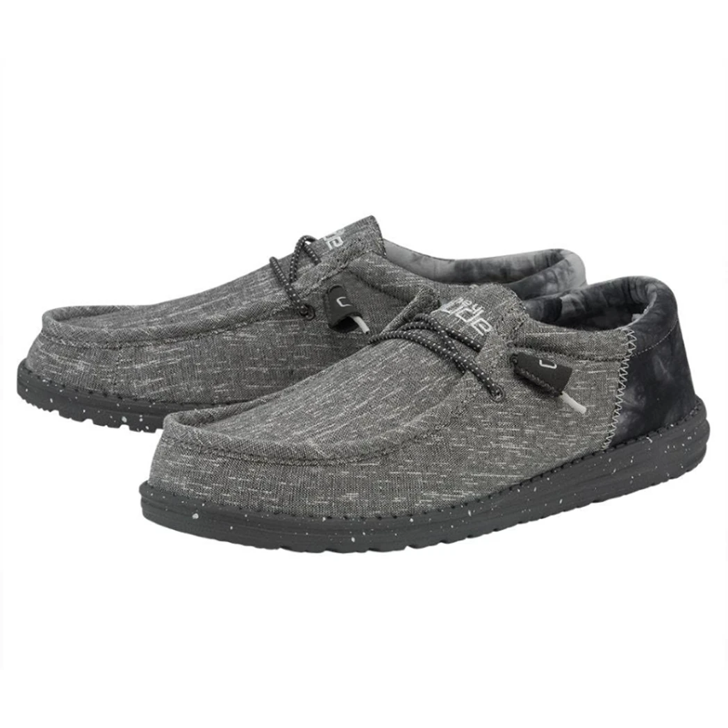 The Wally Funk Raven TieDye from Hey Dude is a great shoe. A modern look with the dark grey upper chambray blend and contrasting heel, featuring a black sole. This shoe features the Hey Dude easy-on system featuring elastic laces, with an ultralight outsole, known for all day comfort.