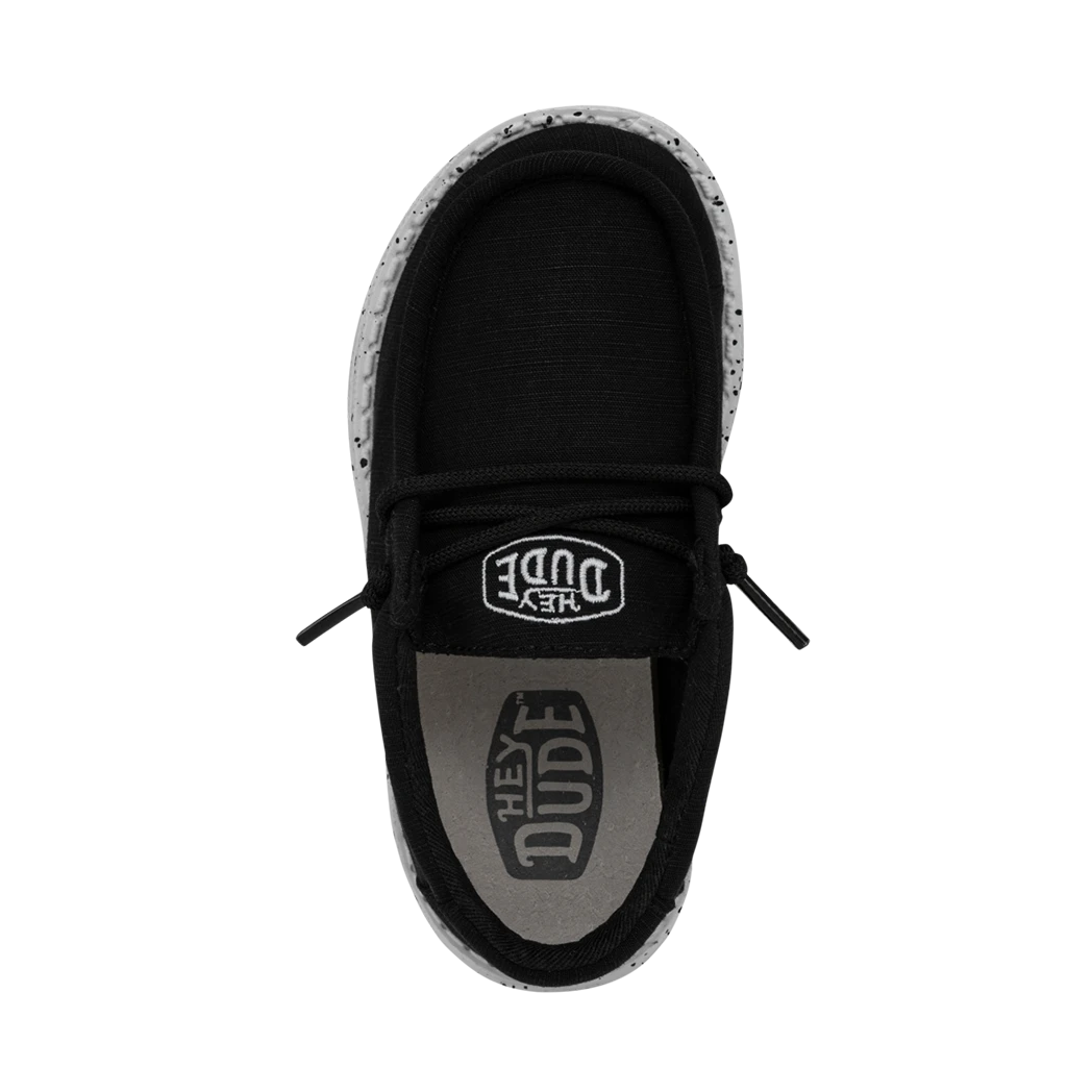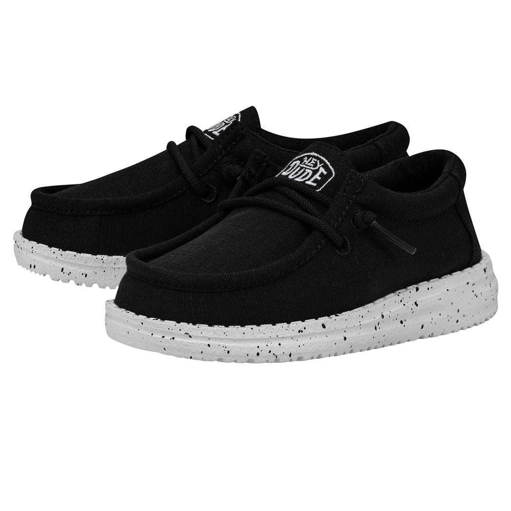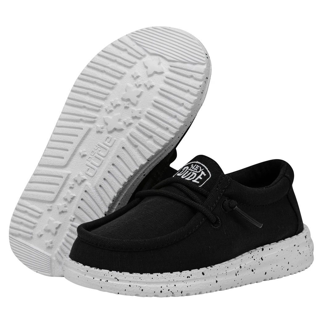 The Wally Toddler Slub Canvas, Black, is the perfect shoe for your little one. The Wally Toddler Slub Canvas collection has all the tried-and-true construction you know and love, but is is extra lightweight for those little ones. It features a durable slub-woven upper and lined with soft cotton for durability and comfort. This shoe features an ultralight outsole with no-tie, elastic laces and a cushioned ankle collar for extra support. Made just right for spirited little feet.