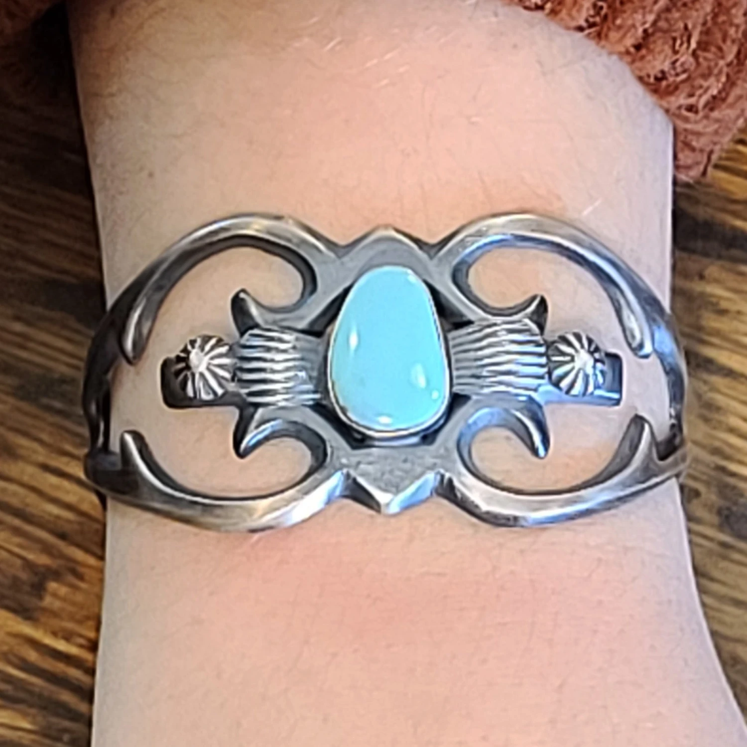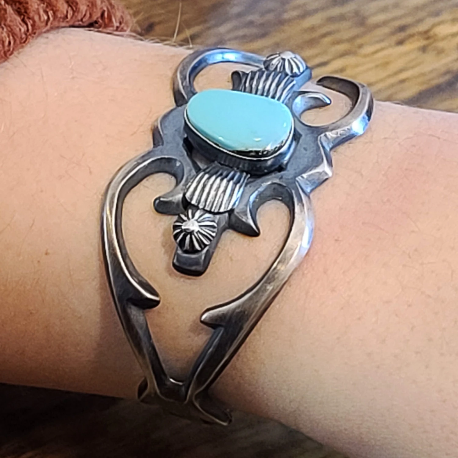 This cast sterling silver & Turquoise bracelet is beauty. The detail in the silver is very unique.