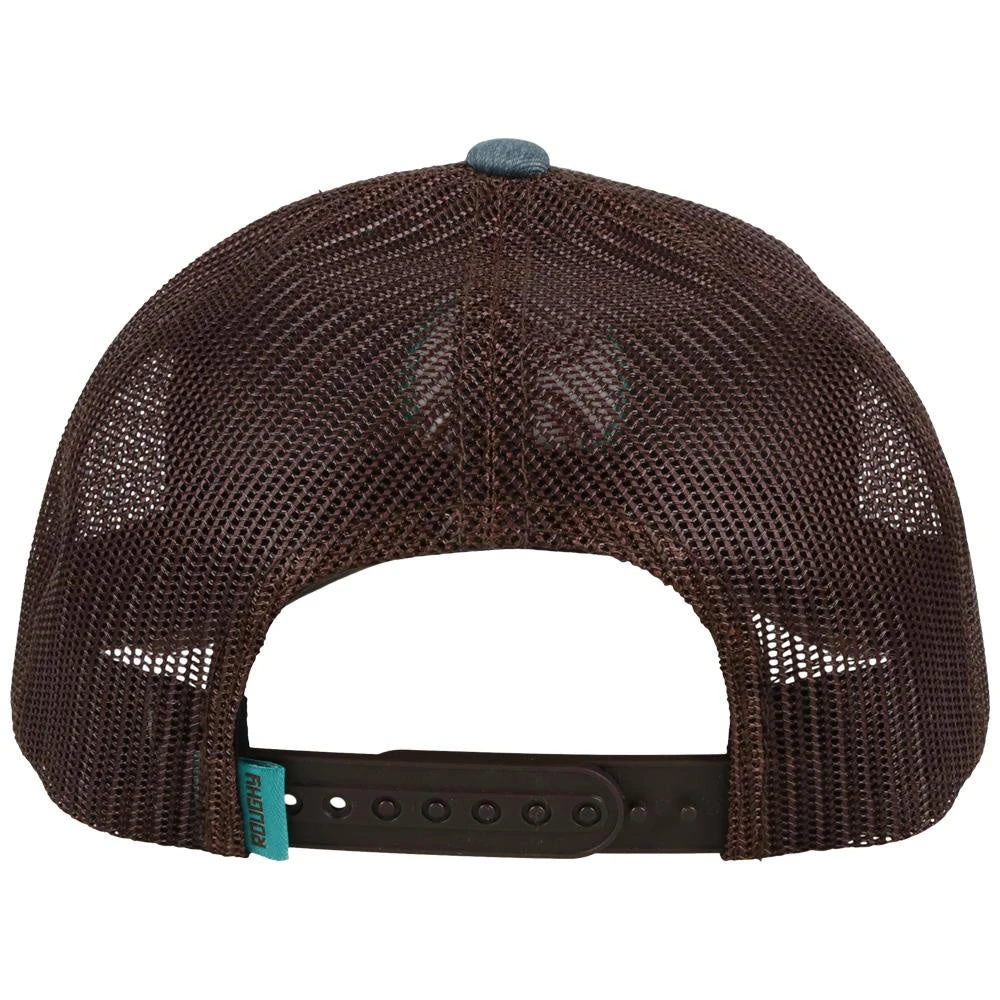 This great looking cap is offered in a mid-profile 6-panel body with a curved bill. Solid denim front with brown mesh back for ventilation. There is a contrasting ROUGHY tag attached to an adjustable backstrap for fit. The puffed brown embroidery ROUGHY O patch stands in a turquoise Hooey O!