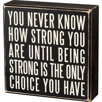 A classic black and white wooden box sign featuring a distressed “You Never Know How Strong You Are Until Being Strong Is The Only Choice You Have” sentiment. Easy to hang or can free-stand alone.
