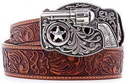 This embossed brown leather Justin Children’s Lil Trigger Belt has the look of exquisitely hand tooled leather with a silver plated six shooter buckle. This belt is made of Genuine Leather and a Silver Tone Buckle.