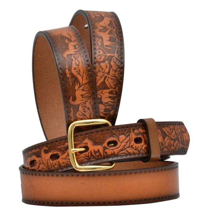 This kid’s belt from 3D Belt Company features a engraved horses throughout the belt. The middle of the belt has a blank leather spot, perfect for engraving names into.