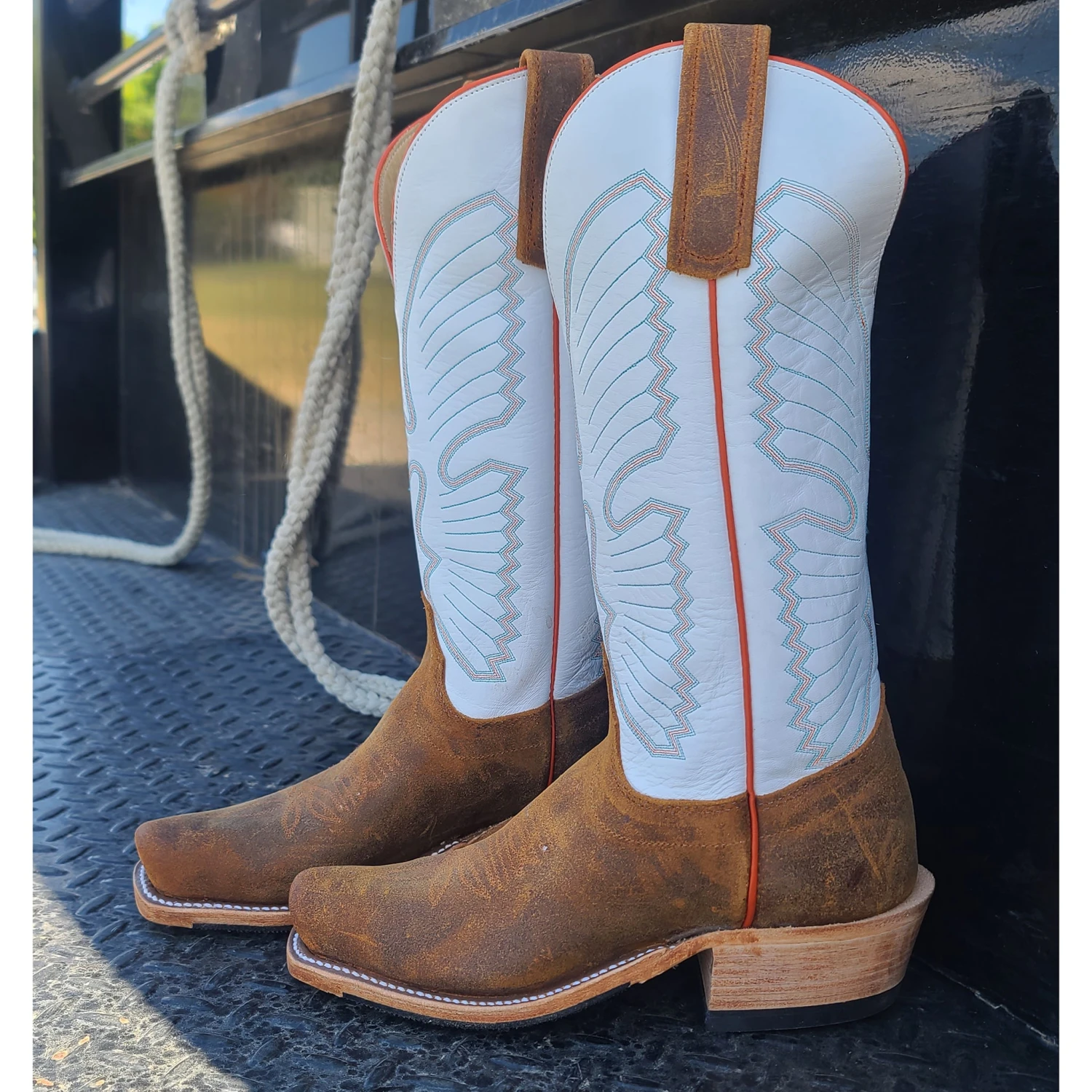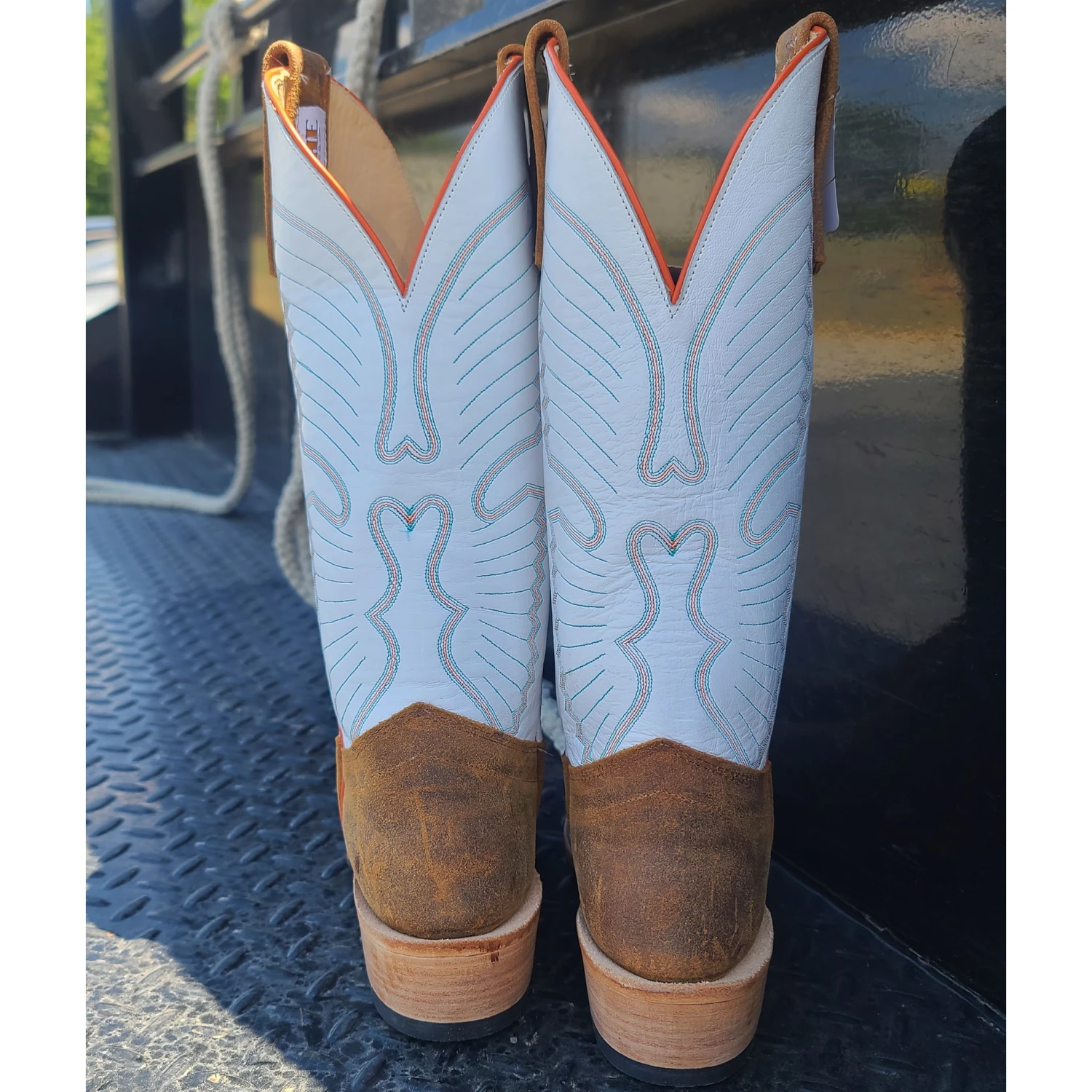 These Olathe Waxy Wheatbuck Kudu boots are about as tough as they come! They are sure to hold up to a full days work! We love the White tops with orange piping, it give this tough brown boot just the right amount of style!!