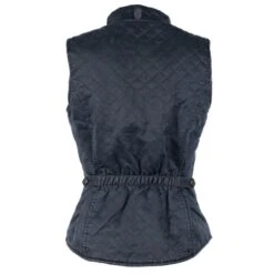 When a coat is too warm reach for this poly-filled quilted vest. It has a quilted adjustable elastic waistband with snaps and a drop down tail hem for extra coverage. It features a 2-way zipper, zip hip pockets and a inside security pocket.