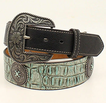 This belt features turquoise faux crocodile embossed leather with large round conchos. This eye-catching belt would be a great addition to any pair of jeans.