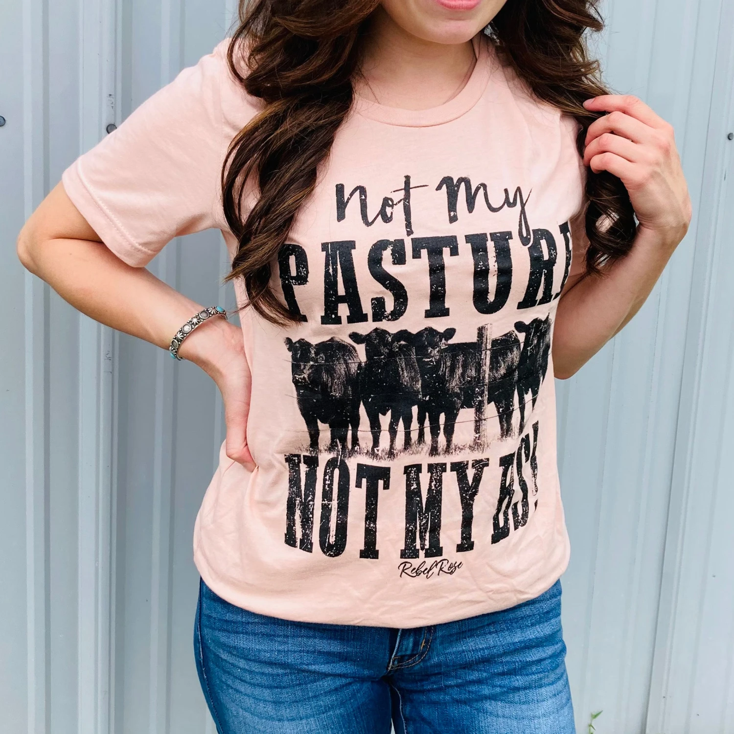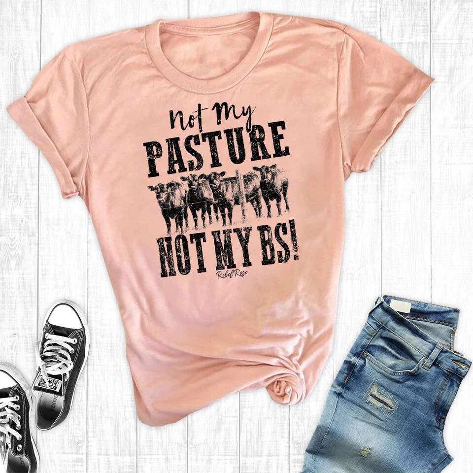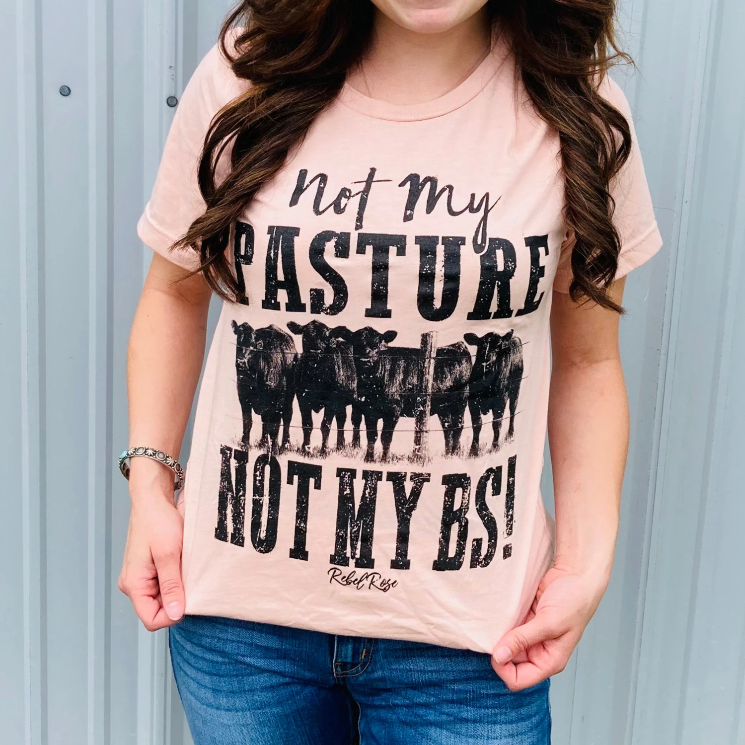 Call it out with this fun tee! Not my pasture, not my BS with a cattle graphic shown on a peach tee.