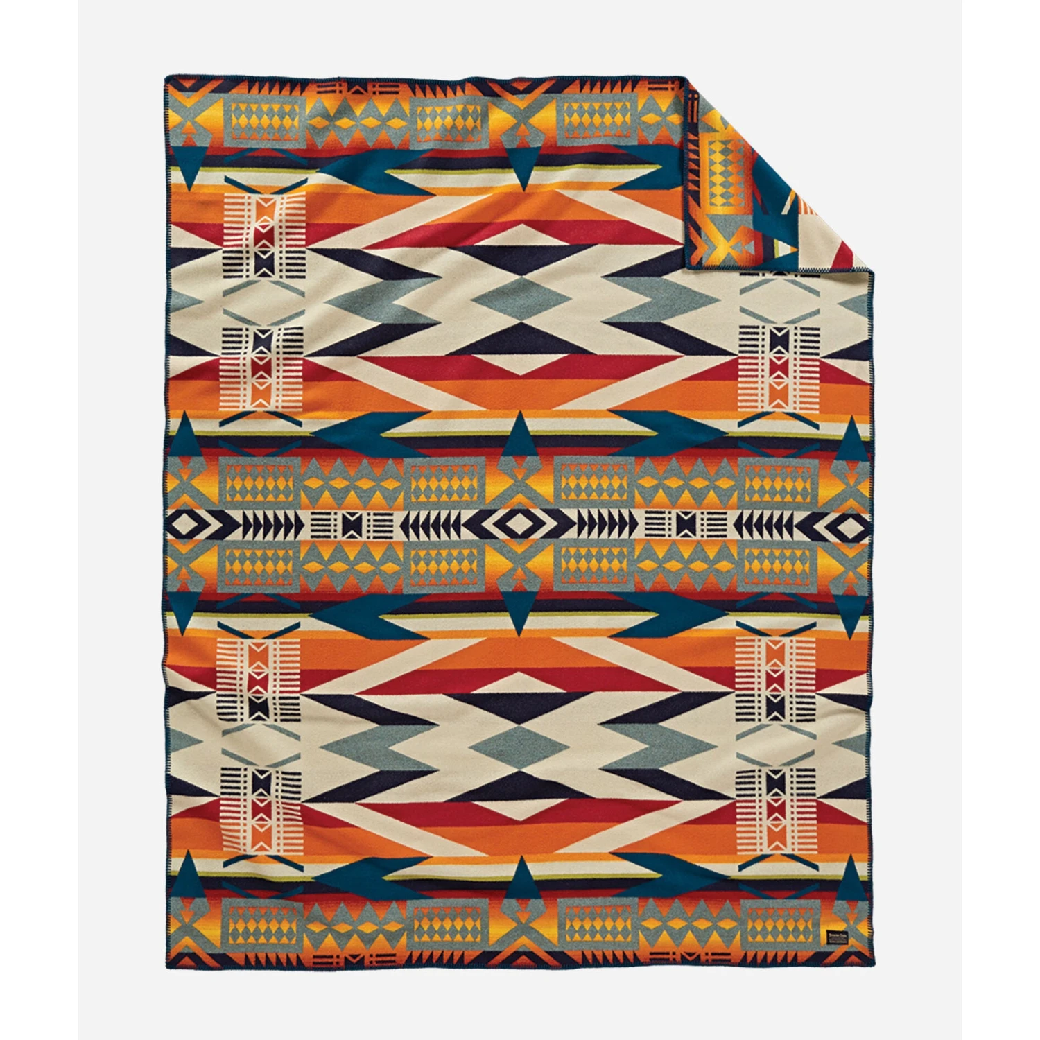 This Pendleton made-in-America wool blanket has a dazzling geo pattern. It’s based on a Native American legend that says a hero disguised himself as a rabbit to capture fire for his people, a victory honored in this vivid design. Reverses to pattern’s opposite.