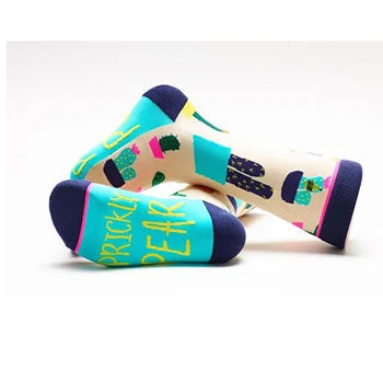 These socks have bright colors of pink, blue and turquoise featuring cactus. They have extra padding in the toes and heel making your feet feel happy. Bottom of the socks says Prickly Pear.