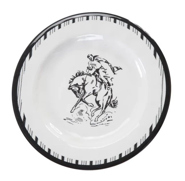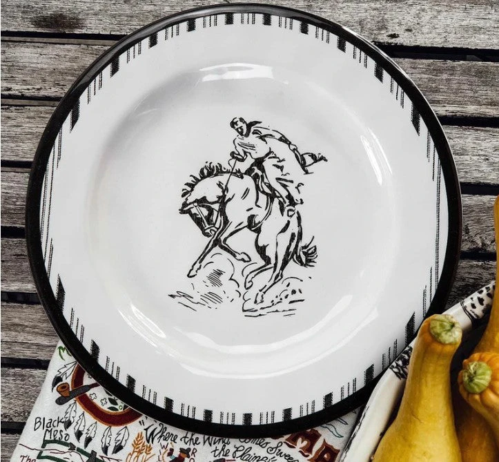 This Ranch Life Melamine Dinner Plate is sure to add Western charm to your dining table. With an image of a bucking horse and rider in the middle, it comes in a versatile black-and-white color.