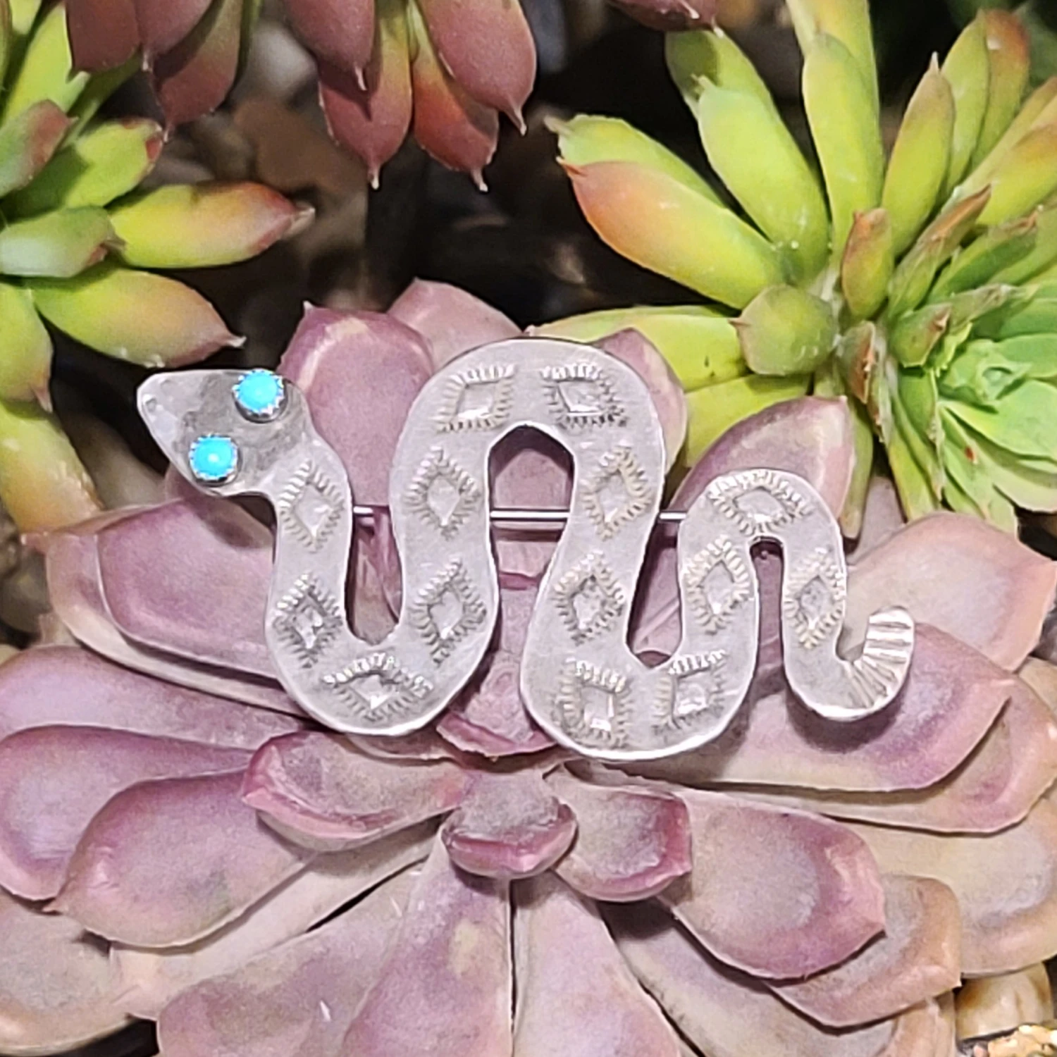 Such a fun snake pin that is sterling silver and has pieces of turquoise for eyes. Put his cute pin on your favorite hat, jacket or bag any add style right away.