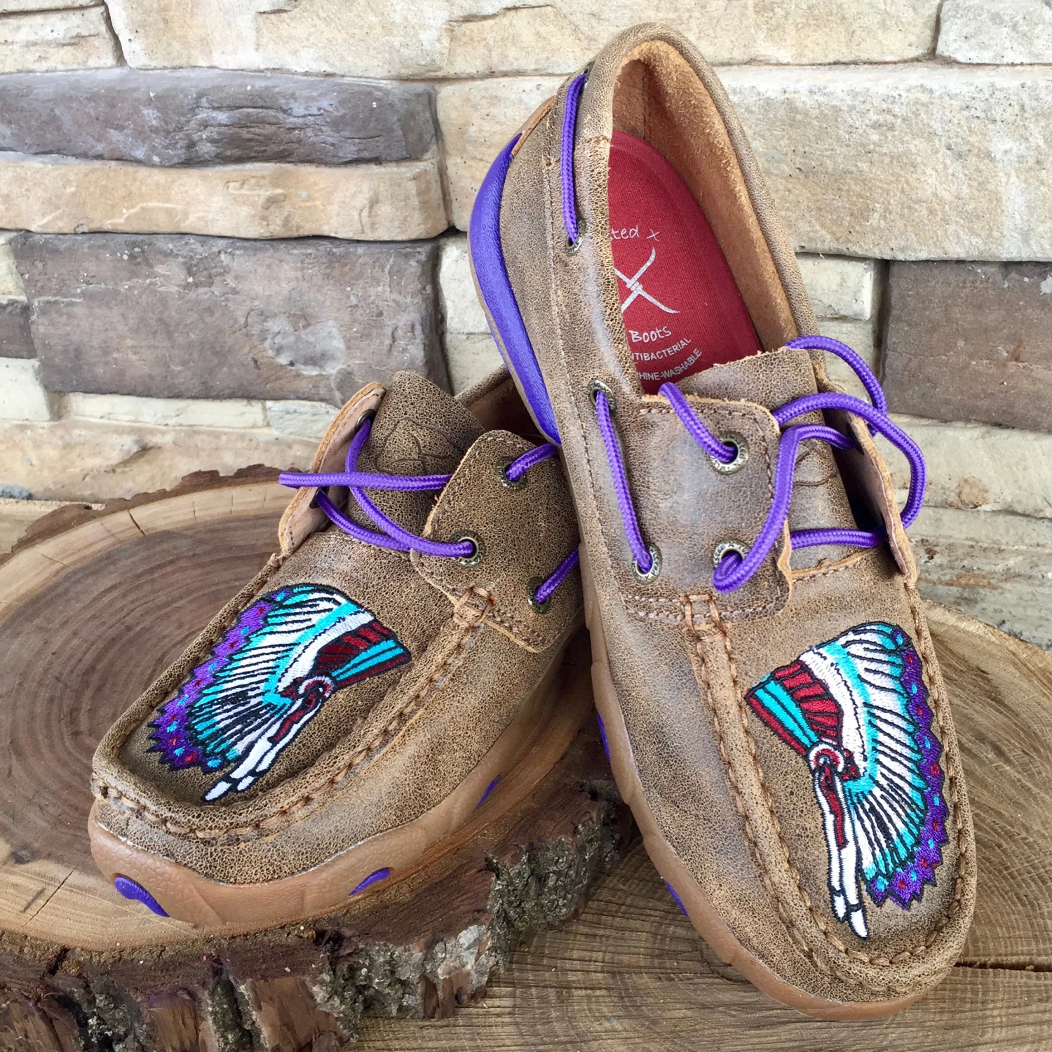 How fun is this Bomber and Purple Headdress driving moc?!?! This is a Western Edge exclusive shoe, you’ll only find it here! This fun shoe features a beautiful headdress design on the toe along with rich violet lacing. Stand out and pave your own way in these awesome mocs!