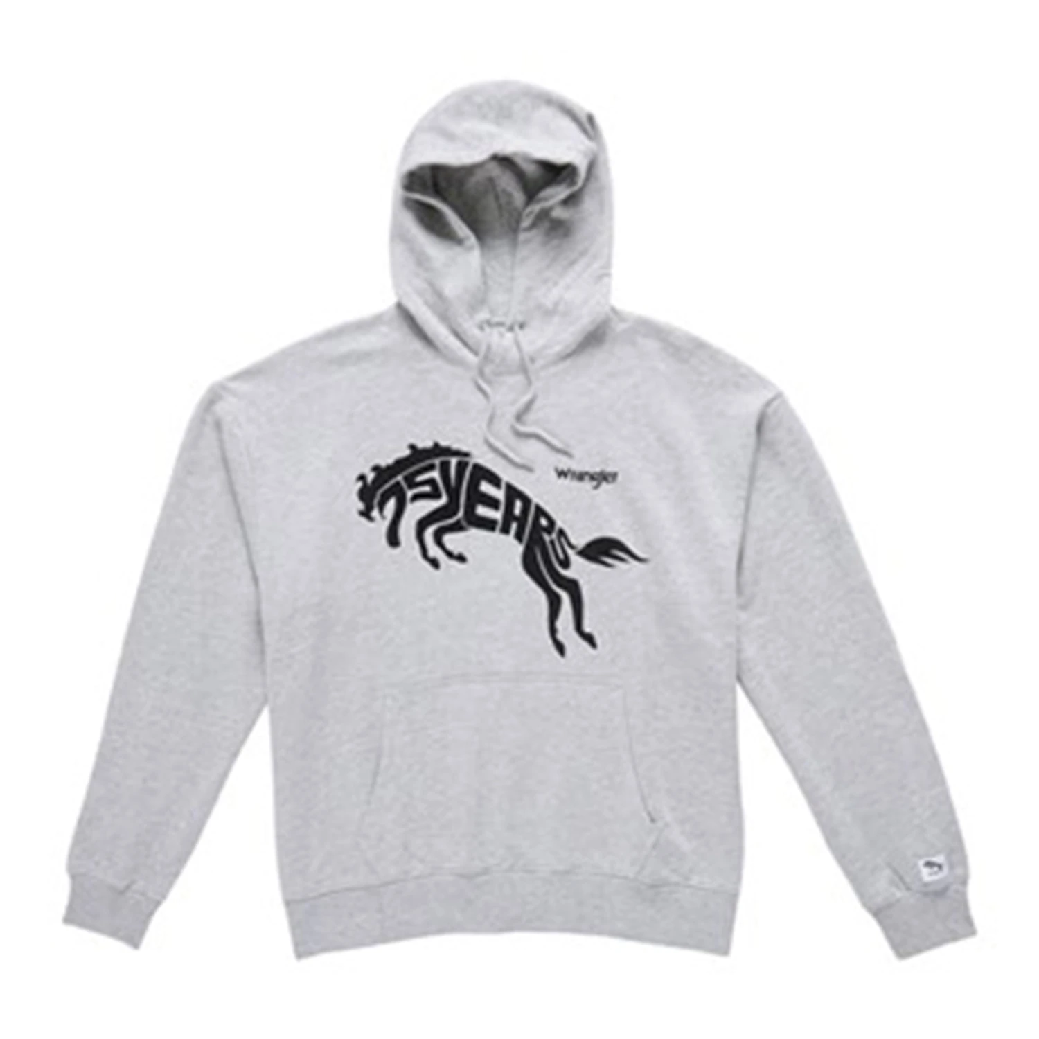 Wrangler Men’s 75th Anniversary Hoodie in mid heather gray. This hooded sweatshirt is super comfortable and has a mustang screen print with 75 years on the body.